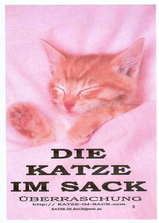 "Die Katze im Sack" ist eine Überraschungstüte für die ganze Familie, mit der Aufschrift "Die Katze im sack" Original Leipziger Wundertüte. Es gibt sie in Deutsch, Englisch, Französisch, Italienisch und Spanisch. Der gemeinnützige Erlös ist für die Aktion Menschen für Tiere, es gibt Sie in den größen A6, A5, A4, A3 und A2 sowie den Preisen von 0,50 € 1,00 € 2,00 € 3,00 € und 4,00 € oder auf Bestellung. Ihr Inhalt sind unter anderem, Geschenkartikel, Hauhaltwaren, Scherzartikel, Spielwaren, tausend verschiedene Artikel des täglichen Bedarfs. Bestellungen unter katze.im.sack@web.de unter Tel 01776311137 oder unter Kleinanzeigen bei eBay und unter facebook Katzeimsack Rainer